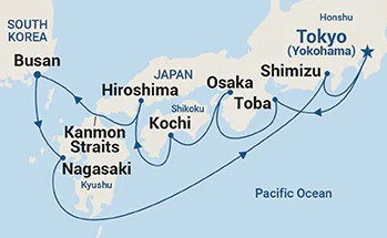 Routes:Tokyo (Yokohama), Japan -> Toba, Japan -> Osaka (for Kyoto), Japan -> Kochi, Japan -> Hiroshima, Japan -> Kanmon Straits, Japan -> Busan, South Korea ->