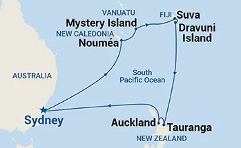 Routes:Sydney, Australia -> Noumea, New Caledonia -> Mystery Island, Vanuatu -> Suva, Fiji -> Dravuni Island, Fiji -> Tauranga, New Zealand -> Auckland, New Zealand -> Sydney, Australia