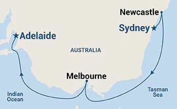 Routes:Sydney, Australia > Newcastle, Australia -> Melbourne, Australia -> Adelaide, Australia