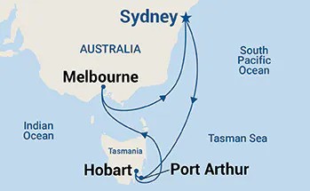 Routes: Sydney, Australia -> Fiordland National Park (Scenic Cruising) -> Dunedin (Port Chalmers), New Zealand -> Christchurch (Lyttelton), New Zealand -> Picton, New Zealand -> Auckland, New Zealand -> Bay of Islands, New Zealand -> Tauranga, New Zealand -> Sydney, Australia