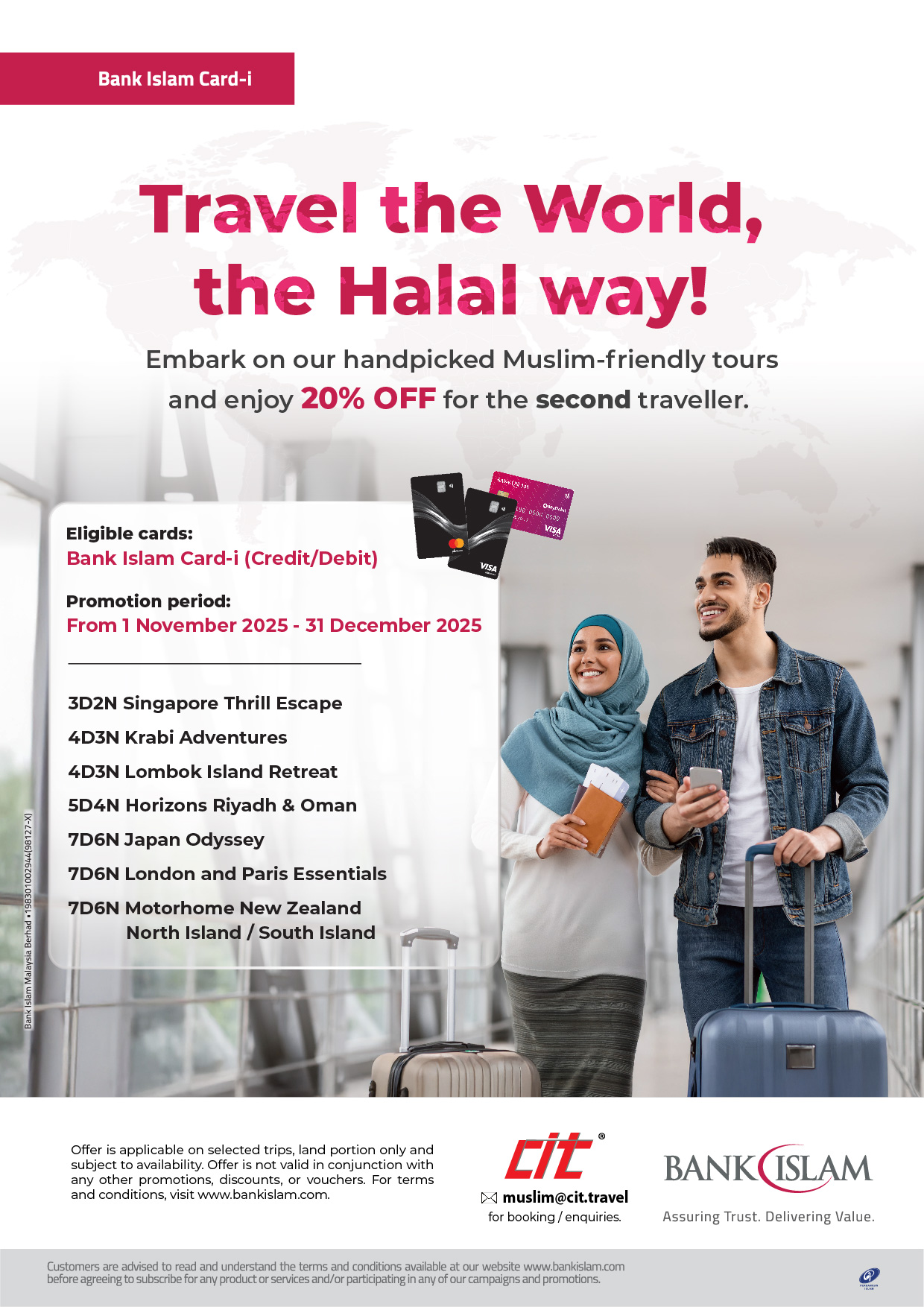 - Cardholders must redeem the offer manually by emailing muslim@cit.travel with their booking details and indicate that payment will be made using an eligible Bank Islam card.